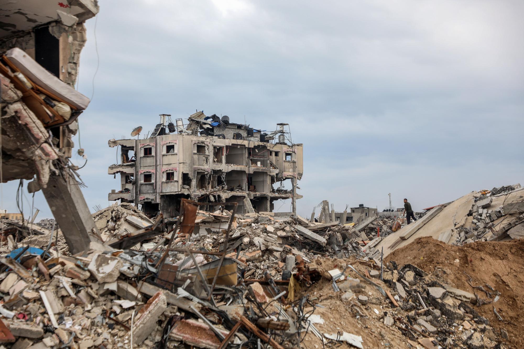 2月9日,巴勒斯坦人站在加沙地带内察里姆走廊附近的废墟上眺望。新华社发(里泽克·阿卜杜勒贾瓦德摄)综合媒体报道,美国国务院在2月28日晚些时候发给国会的一系列通知中说,此次向以方提供的第一批军售包括超过3.55万枚重2000磅(约907公斤)的MK 84重型炸弹、BLU-117钻地炸弹以及4000枚“捕食者”无人机弹头,其总价值达20.4亿美元。美国防部说,这批武器将于2026年开始交付,但“其中的部分采购可能来自美国库存”,意味着这部分武器有望立即交付。